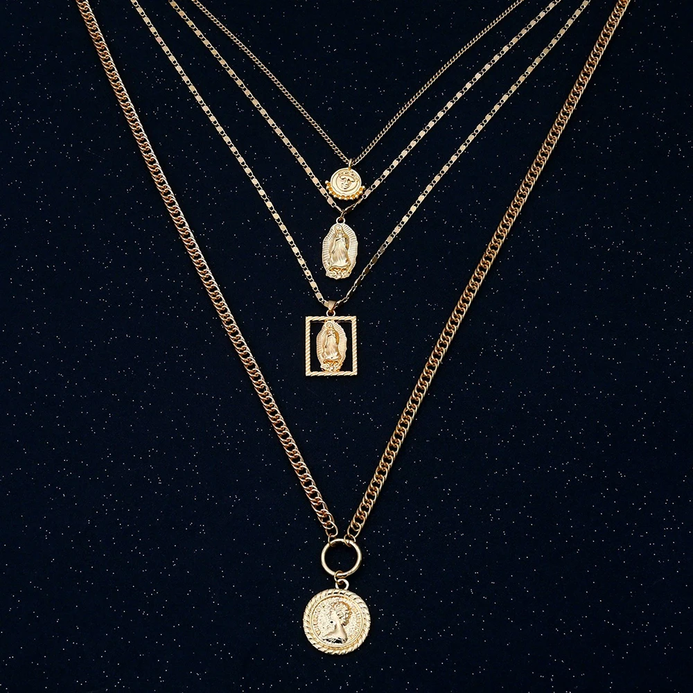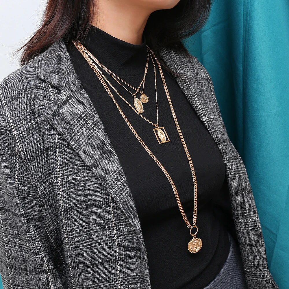 joejerry Layered Pendant Necklace Gold Filled Chain Woman Engraving Human Face Necklace Long Sweate
